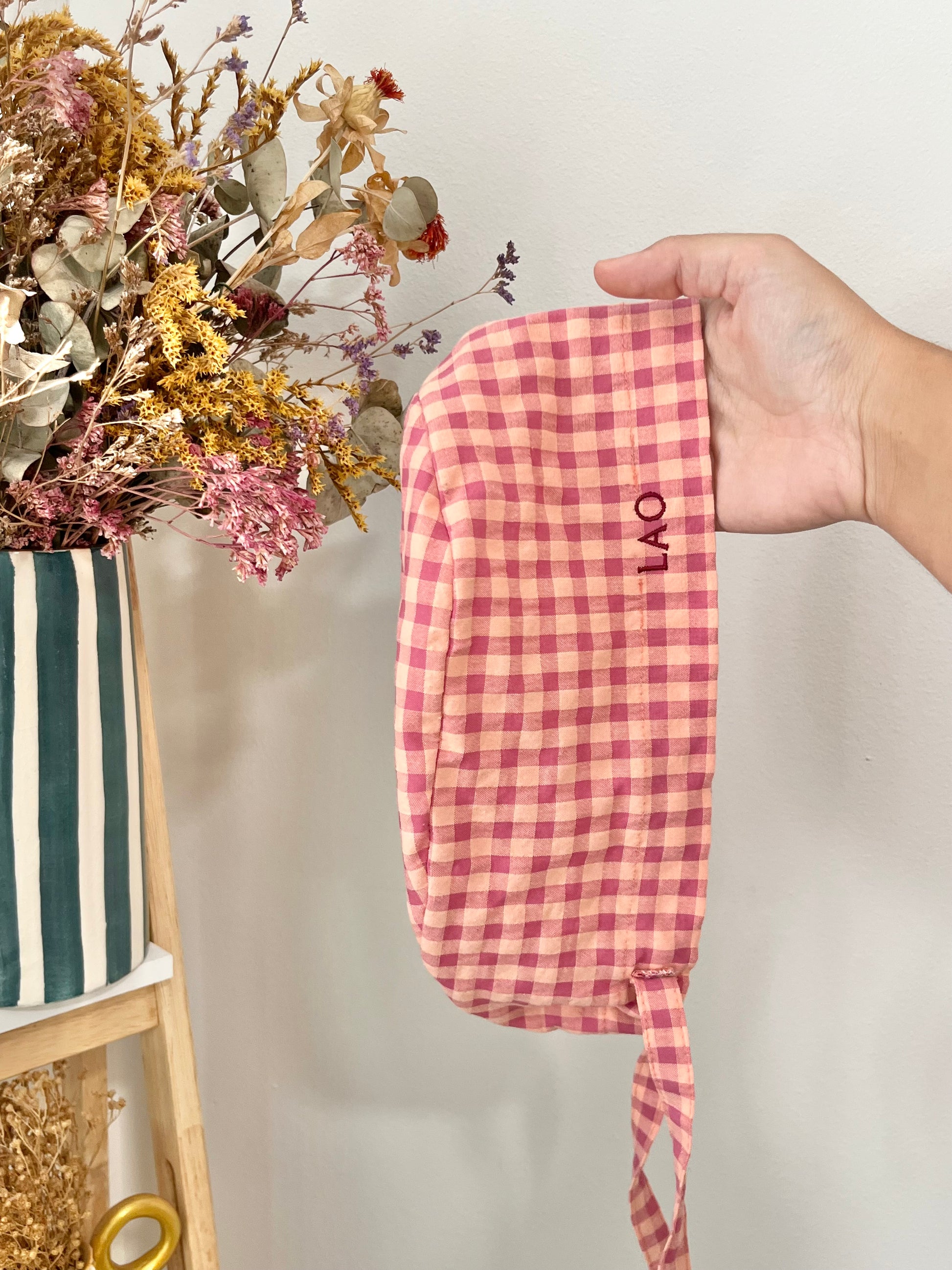 Gorro vichy rosa y mandarina